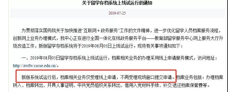 一、2019年08月05日留学存档系统上线试运行,档案相关业务的办理采用线上申请服务模式,访问地址:http://zwfw.cscse.eu.cn/。