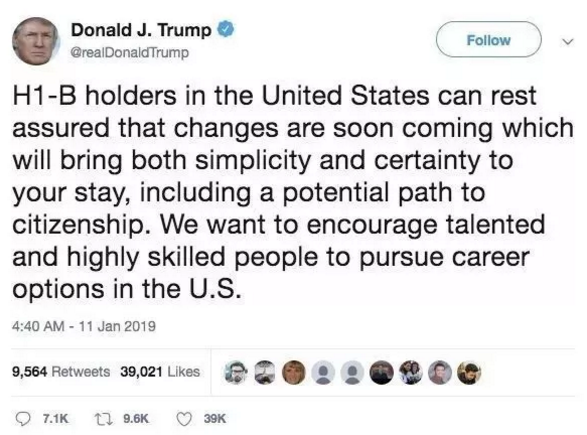 不过在1月11日,特朗普深夜又发推特关心起了H-1B学生们的移民之路,虽然他对H-1B都拼错了,不过相关改革究竟是否会改变就不得而知了。