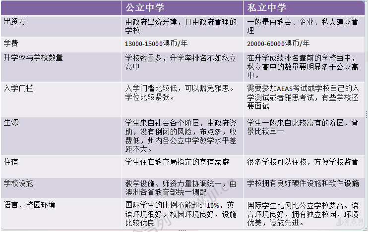 由于私立中学的学费普遍高于公立中学,因此,总体来说,私立中学的平均硬件设施、师资力量等要好于公立中学。需要指出的是,私立中学对海外学生的收费是一个学校一个价格,公立中学的收费则是由澳大利亚的州或地区的政府教育局统一制定的;比如,在悉尼所在的新南威尔士州,目前一共有113所公立中学可以招收海外学生,它们的2012年学费均为13000澳元。