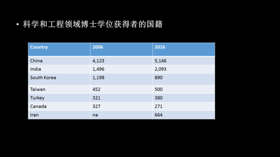 在科学和工程领域博士学位获得者中最多的是中国人,相对来说,亚洲人的占比是最大的。