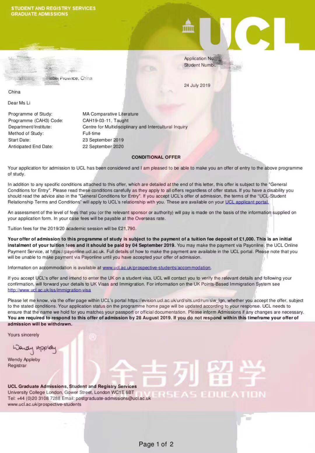 这是一份令人激动的录取。我们成功为我们的L女士拿到了UCL伦敦大学学院比较文学专业的录取!今年1月在我们机构签约办理了留学,这之前她其实已经在其他机构办理了爱尔兰,但是申请结果不满意,可是顾问和机构并不打算帮她去做任何争取,这让她很心伤,后来通过朋友介绍认识了我们经理和我,我们沟通之后一拍即合,开始申请,除了基本的申请材料,我们想到了为她的职业生涯做一份作品集,毕竟跨专业申请我们更需要突出自己的优势,申请之路真的是好漫长……中间我们经历了圣安德鲁斯大学三次要雅思成绩不肯下录取,多次跟催各个学校。由于申请时间较晚,大家也很担心学校名额的问题,只能多次跟催希望尽快拿到结果。终于我们成功拿到了英国G5,世界前十UCL的录取!疯狂为我们的TEAM 我们的文案老师,我们的外联老师打call