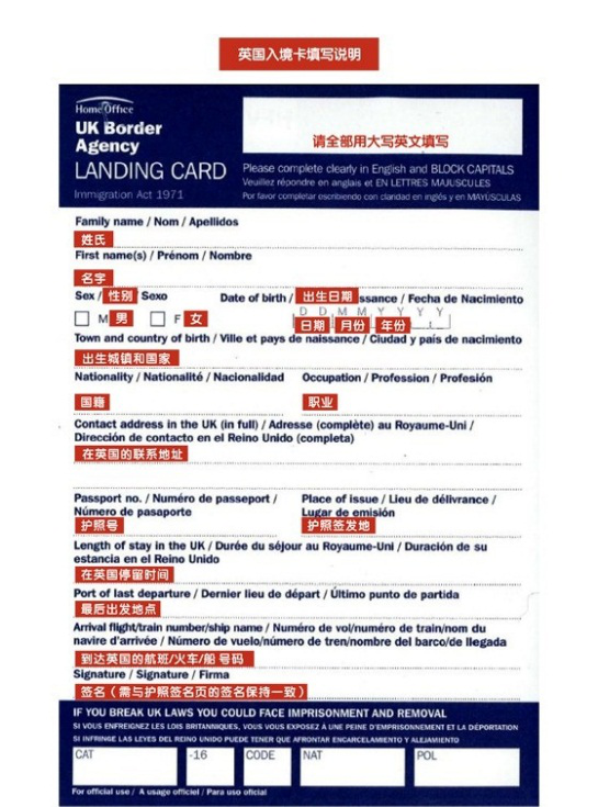 第十行:到达英国的航班/火车/船号码。如果是坐飞机入境,写上你乘坐飞机的航班号就行,机票上就能找到。同样坐火车或者船入境的话,在车票船票上都能找到号码。