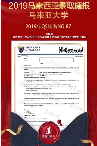 恭喜:Q同学,无雅思,双非一本,均分82,马来亚大学 计算机科学硕士录取!