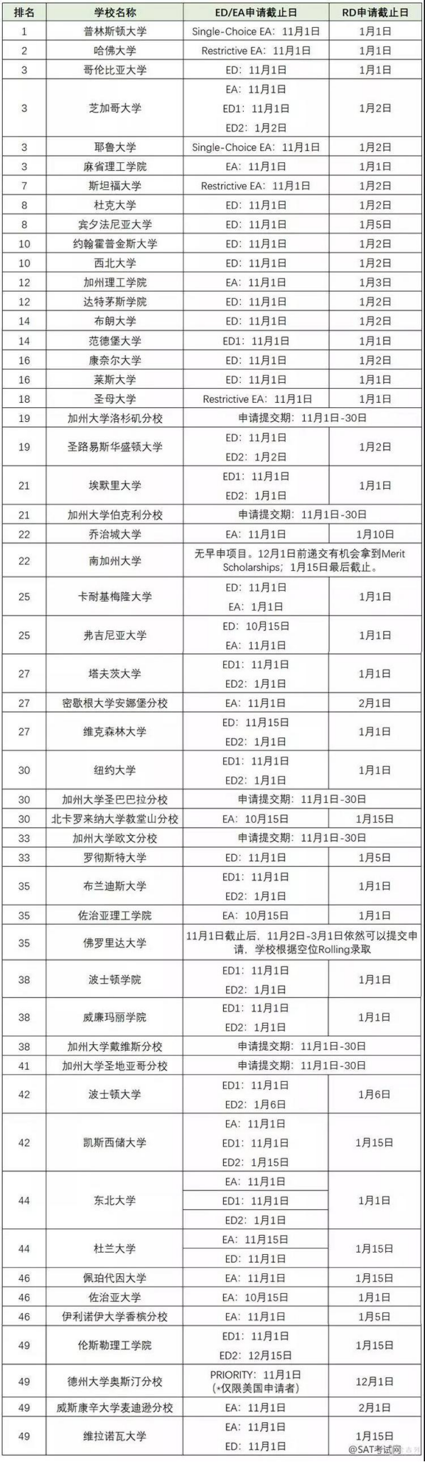 随着UC系统和common系统的开放,接下来要做的就是了解美国各高校申请截止日期,接下来给大家分享的就是美国TOP50的申请时间节点,根据往年的数据统计,ED/EA 轮次的录取几率要远远高于 RD 轮次。简单来说,ED 对申请者具有约束性,录取了就一定要去。所以从理论上说,你不能同时申请 2 所 ED 学校。而一般的 EA 不具有约束性,被录取了也可以不去,而且学生可以申请不止一所大学的 EA。