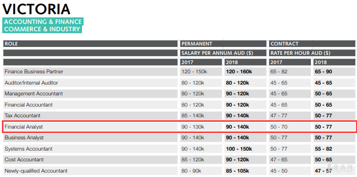 负责预算、分析和咨询顾问,是一个偏综合性部门,可以接触到各个部门管理层的人。在薪资方面,根据世界知名猎头公司 Robert Walter 发布的 2018 澳洲 & 新西兰薪酬调查报告显示, Financial Analyst 薪资普遍在 9~14W 澳币,可谓相当丰厚!