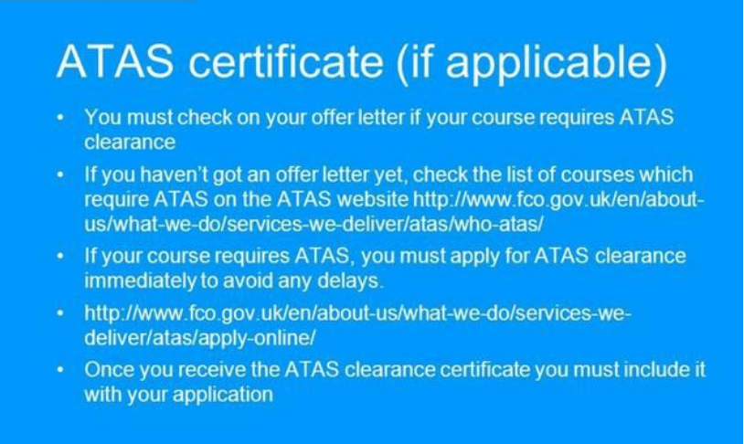 Acaemic Technology Approval Scheme (ATAS) 证书是在 2007 年 11 月 1 日推出的,是英国反对核扩散义务的重要组成部分之一。它的出现是为了控制有关大规模杀伤性武器及其运载工具扩散的知识和技术的传播。旨在保证那些申请某些敏感学科课程的学生不会获得潜在的关于大规模杀伤性武器及其运载工具扩散的知识。某些课程在学生申请签证时需要提供 ATAS 证书,所以大家要提前申请,避免由于没有 ATAS 证书影响签证申请的情况。