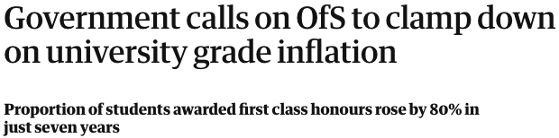 前几天老师曾说过,根据学生办公室(OfS)最新发布的数据显示,在过去七年中,英国大学获得一等学位的学生比例飙升了80%!