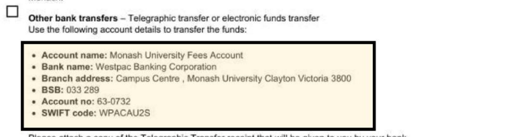 几乎所有澳洲学校目前都接受留学生以电汇的方式支付学费。在小伙伴们收到OFFER后,请注意里面的学费缴纳相关信息。学校一般都会在OFFER里一并附上他们的银行信息,收钱这种事怎能不积极 ~