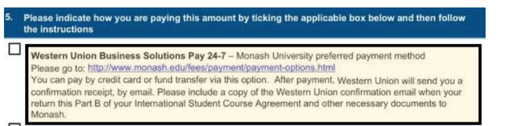 例如下面这个学校提供的付款方式,黄色区域的就是第三方支付平台WesternUnion。