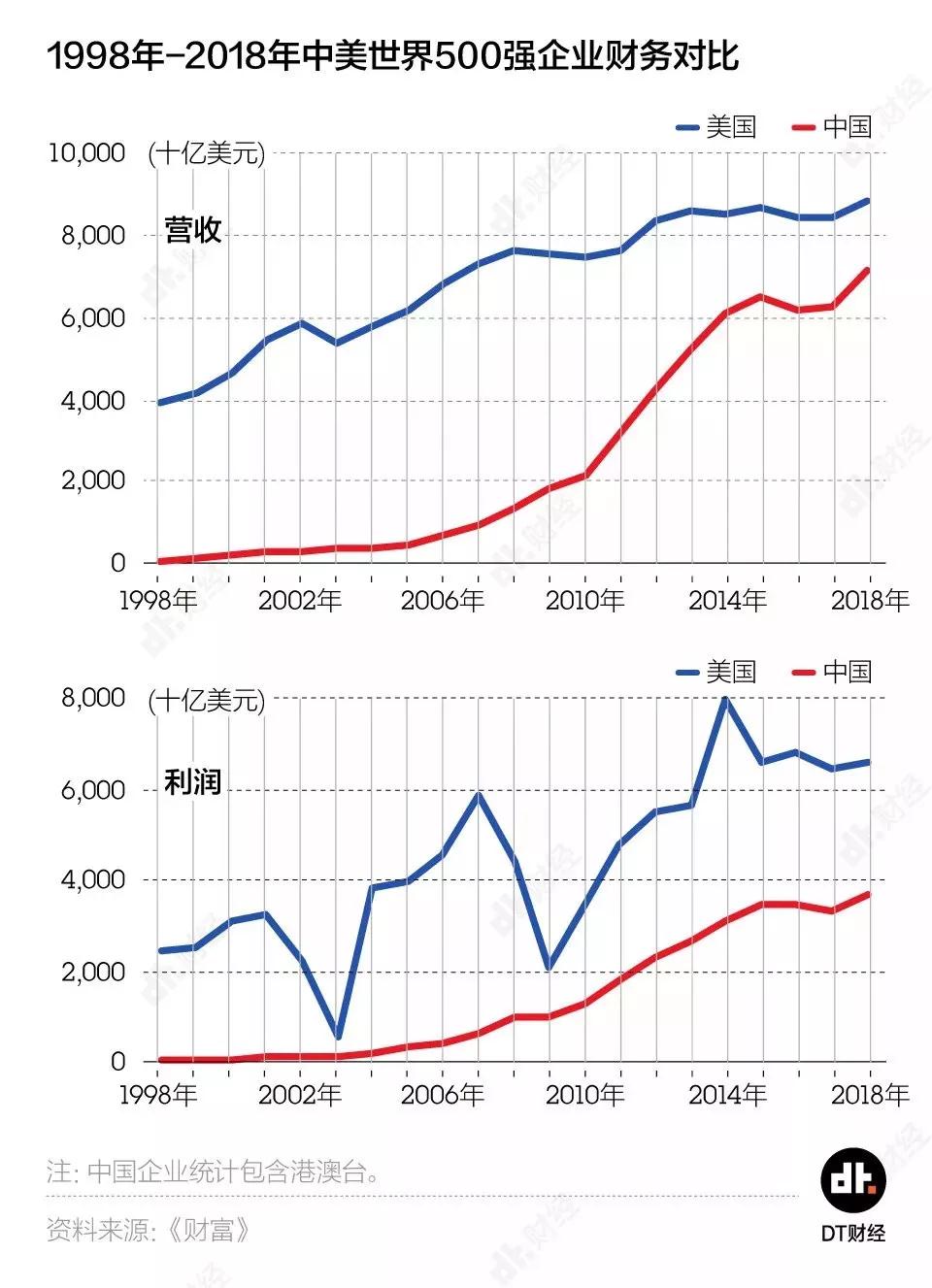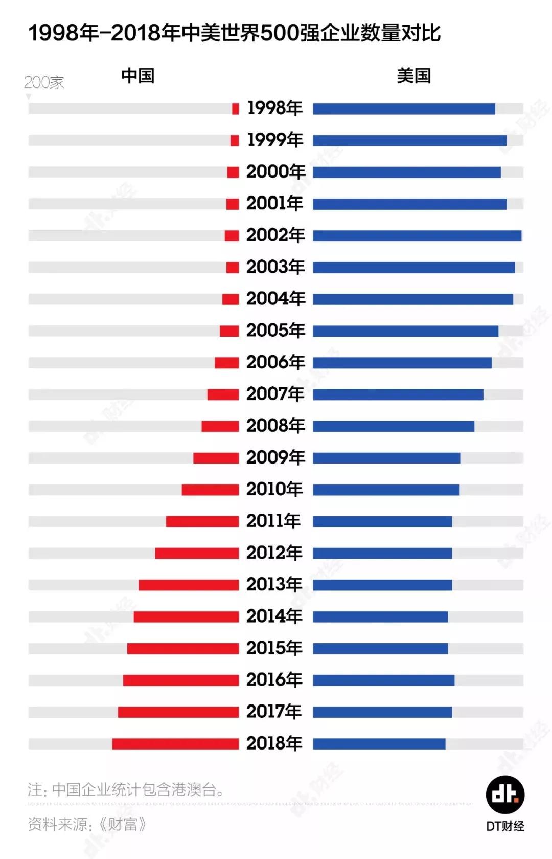 1998年,中国500强数量还只是美国的三十分之一,仅有中国银行、中石油、中石化、国泰人寿保险、中粮集团,以及由两个英国人在广州成立的怡和集团共6家企业上榜。到了2018年,中美间的差距缩小到仅有6家,而美国在2002年数量达到巅峰之后就开始走下坡路,2019年更是被中国超越。
