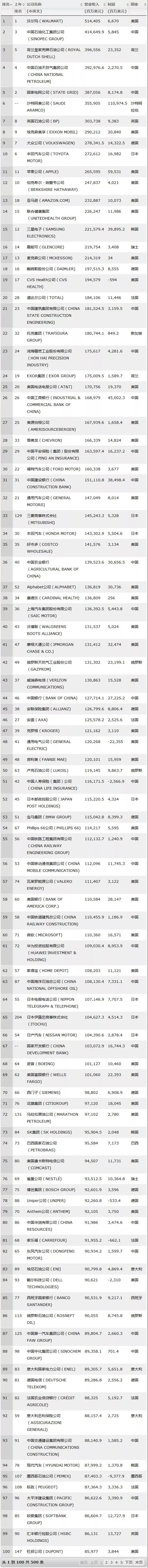 沃尔玛连续第六年成为全球最大公司,中国石化位列第二,壳牌石油上升至第三位 ,中国石油和国家电网分列第四、第五位,新上榜的巨型石油公司沙特阿美则位居第六位。