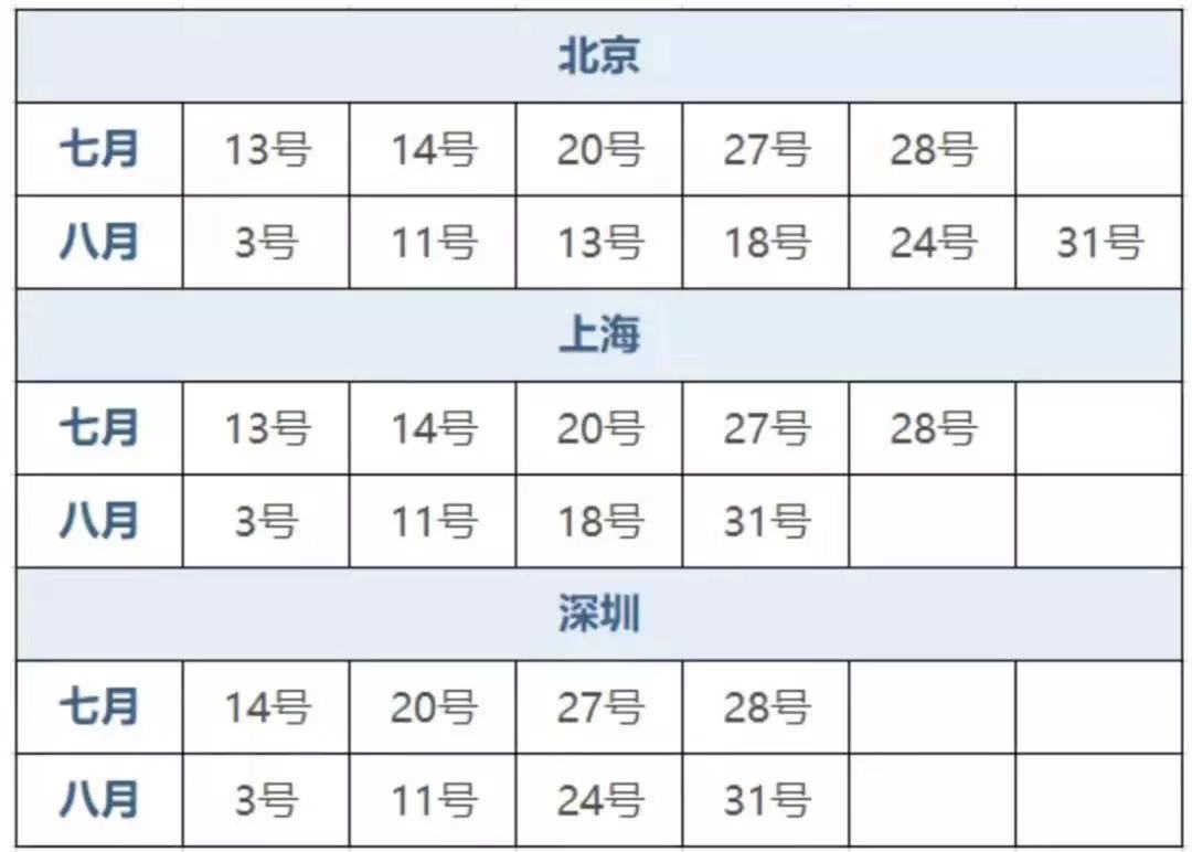 以下是7-8月间开放面试的城市及日期: