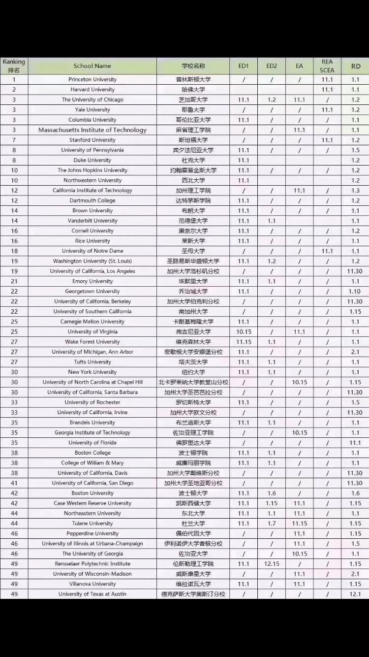 最后是梁老师带给大家的福利:2020年申请季美国TOP50的EA ED RD申请时间。大家请参考这张表格,但是不同背景的学生 哪些学校作为ED申请,哪些学校作为EA申请,哪些学校作为RD申请,又是一门学问,请大家私聊梁老师,接受更有针对性的咨询。