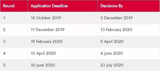 今年申请商科硕士学位仍然是采用多轮审理,有5轮非MBA专业和8轮MBA专业。 第一轮申请截止日期为2019年10月16日,申请结果将于12月5日前通知。