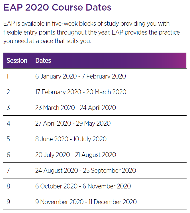 学术英语(EAP)有三个入学时间点可供选择 - EAP I,EAP II和EAP III 课程和考试涵盖了学生在大学学习及生活的场景中密切相关的内容, 帮助学生培养学术英语技能的同时也将为学术雅思考试做准备。EAP也是入读UQ的桥梁课程之一,通常作为UQ打包录取(需要雅思或其他公认的测试结果)的一部分。换而言之,学生在结业后依然需要提供相应的雅思成绩才能够入读UQ主课课程。