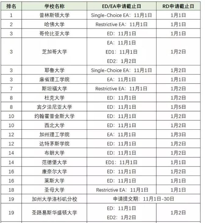 提前申请的截止时间一般是11月1日,如哥伦比亚大学、宾夕法尼亚大学; 有的学校是11月15日,如斯沃斯莫学院、史密斯学院。 少数学校有不同规定,如北卡罗来纳大学和佐治亚理工学院截止日期是10月15日。 ED录取结果发布时间一般是12月15日左右,EA部分学校要等到1月才会出结果。