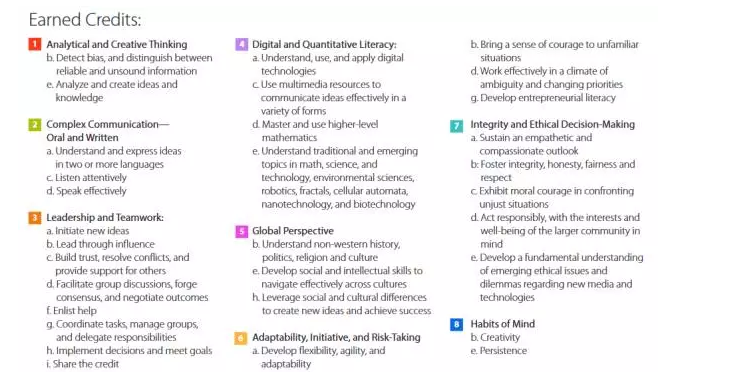 这个计划的核心给学生一份不包含任何课程成绩的“水平成绩单” (Mastery Tran),在这个“成绩单”里只有关于这个学生能力的具体描述,比如,关于一个学生的西班牙语能力的描述,不再写他通过了西班牙语某级,而是写,这个学生可以听懂西班牙语并且流利表达自己的想法。不再给学生分数,只是描述学生的能力。学生不管是在课堂上学到技能,或者是在课外学到的技能,只要能展示出来,都可以在这个水平成绩单上得到展示。