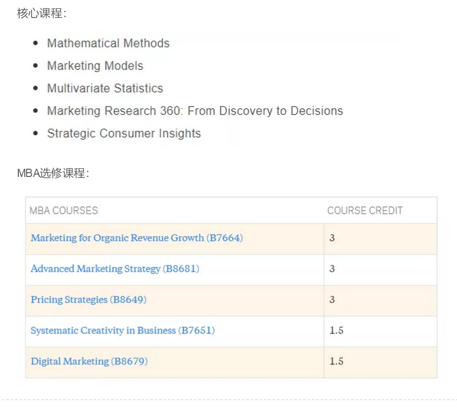 此项目为quarter制,项目时长15个月,需修习完18门课程,其中包括5门核心课程,分别是: 消费者行为预测、市场管理、整合营销战略过程、数据市场分析、金融会计。