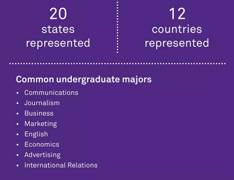 相较哥伦比亚大学的市场营销专业,西北大学的IMC,班级人数更多,录取率也相对较高,对申请者的工作/实习经验要求也会宽松。 本科学历分布也更为广泛,对申请者的专业背景没有要求, 任何专业都可以申请,但大部分都来自传播、广告、新闻、市场营销、经济等专业。