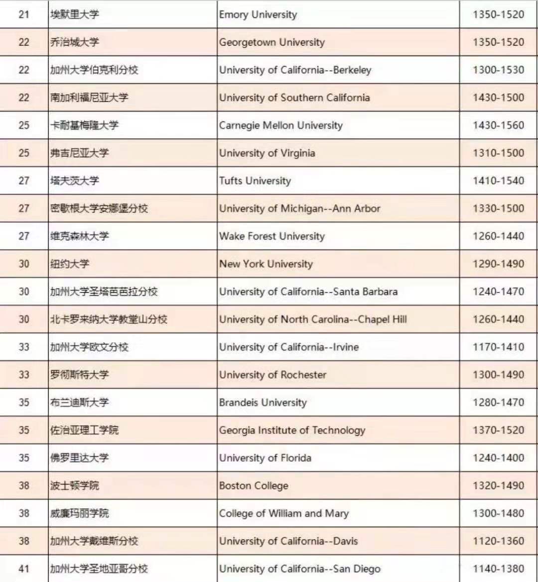 这个排名段的选校从录取要求和着重点看起来都更加多元。 加州大学洛杉矶分校、密歇根大学等公立大学的录取率也不是很低,他们还会考虑学生的居民身份等因素。 这个排名段竞争最为激烈的是乔治城大学、塔夫茨大学、加州大学洛杉矶分校和南加州大学。 前两所大学在分数上更接近排名前 20 的水平,后两所更为平均,注重综合实力。
