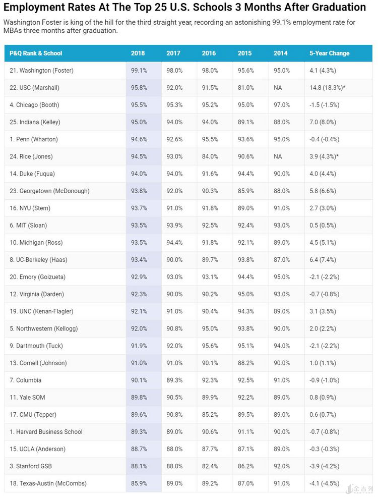 通过排名看到,其实商科项目就业前景比我们想象的好一点,有19所商学院毕业三月内就业率达到90%以上,其中华盛顿西雅图大学Foster商学院就业率达到99.1%。