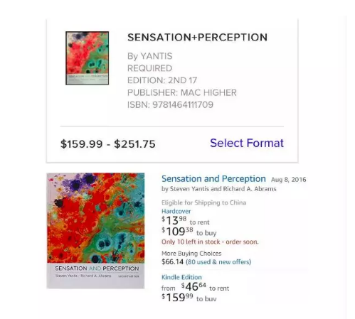 以下面这本《Sensation an Perception》为例,新书在160美元左右,租书却只需要14美元左右起,二手书也便宜不少,是80美元起。