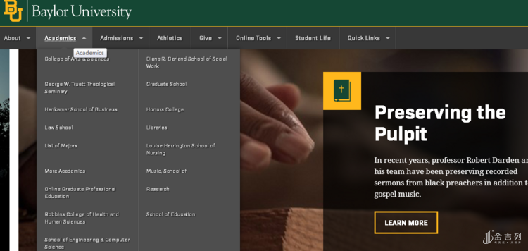 贝勒大学(Baylor University,简称BU)成立于1845年, 是美国最古老的私立大学之一,也是全世界最大的浸礼宗大学。该校学生通过宗教和社区服务紧密的团结在一起,在校学生每学期会花费12,000个小时来完成一个名为“Steppin’ Out”的服务项目。除此之外,学生还可以参与当地社区的服务项目,也可以参与国际服务项目。学校宗教氛围浓厚,就连学生团体也积极参加宗教活动。贝勒大学规定新生必须住宿校园,参加两个学习的礼拜互动,每周一和周三还需参加礼拜仪式。另外,在校学生和教职工每天还会在校园聚集祈祷,每周的”Dr Pepper Hour”学校还会派发免费的冰激凌。