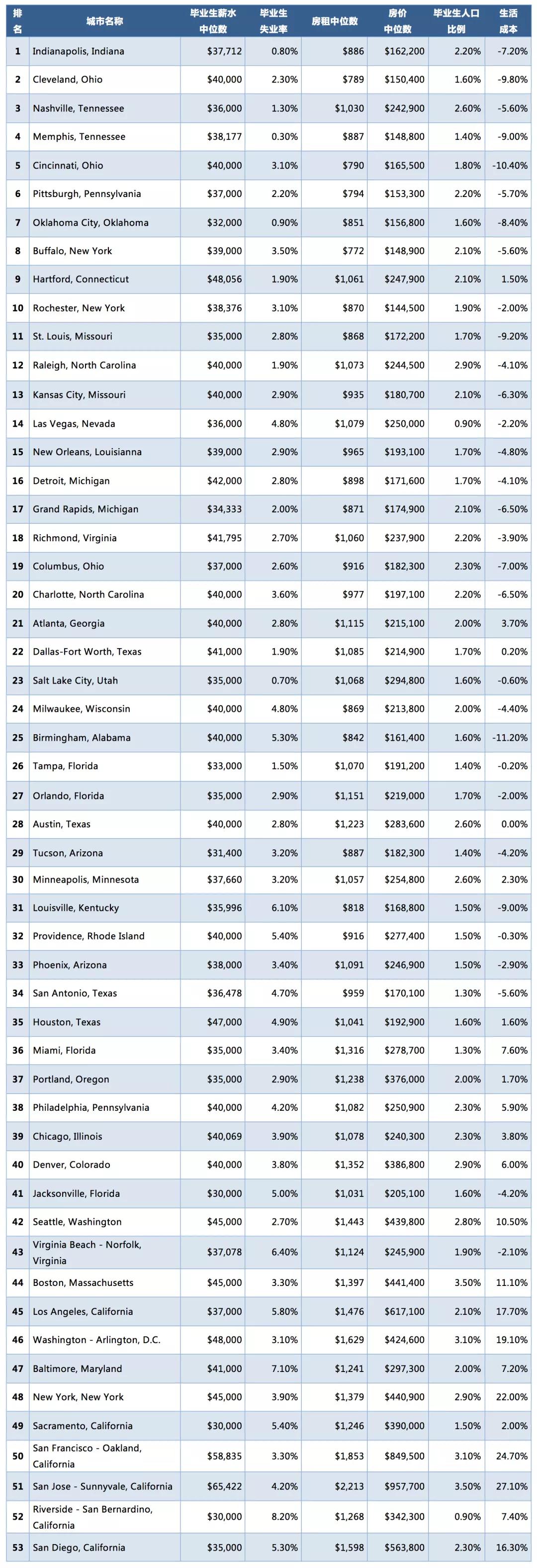 除了排名,调查还得出了毕业生找工作的有趣数据。杰克逊维尔(Jacksonville)、萨克拉门托(Sacramento)和河滨-圣伯纳迪诺(Riversie-San Bernaino)的毕业生薪水中位数只有3万美元,是上榜的大都市中最低的。
