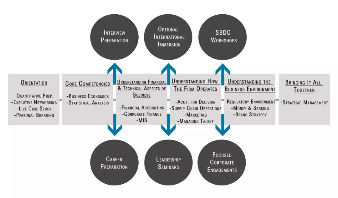 在为期两周的课前培训中,你将通过综合的交流和演讲技巧研讨会来提高你的与管理相关的各方面能力。你将建立团队精神和领导能力,获得宝贵的跨文化技能。通过与企业业务主管的接触,现场案例研究和网络机会使你能够发现职业机会,了解招聘过程,完善你的简历,提示你的个人品牌。
