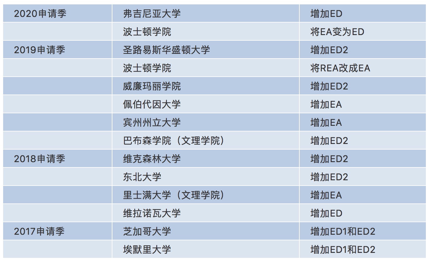 纵观过去几个以及即将开始的2020申请季,基本上 每年都有大学将ED纳入计划,或改变自己的早申政策 :