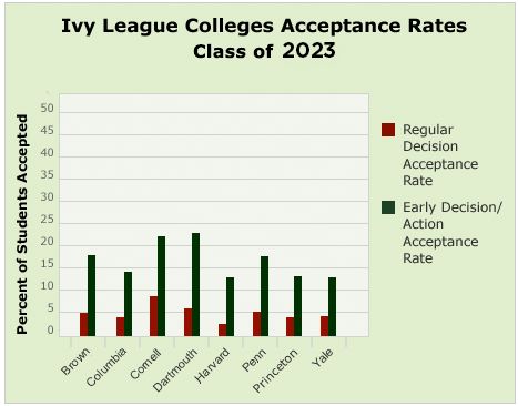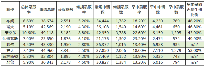 名校对早申学子的“偏爱”,从录取率数字上就可以明显看出来。 以八大藤校2019申请季(2023届)录取为例: