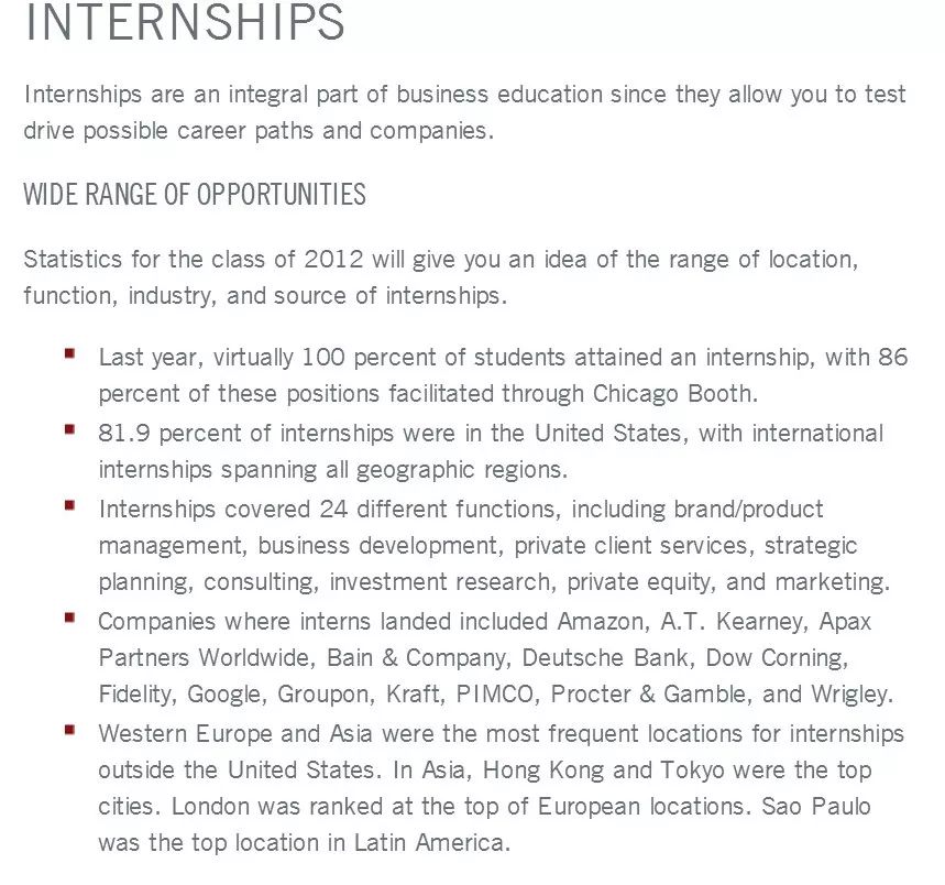 以其独特的地理优势和教育水平,布斯商学院吸引了众多世界顶级公司。 学校也为学生提供了多种渠道接触这些公司,取得实习机会。 如校园咨询、网上职位申请、搭建校友网等。
