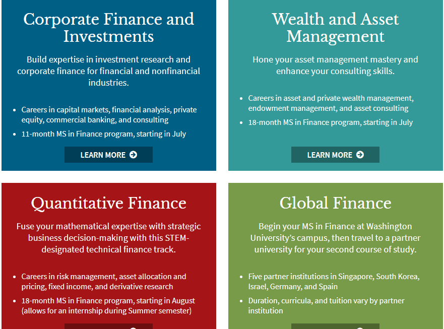 金融,金融工程,商业分析,都是大数据环境下热门的专业,圣路易斯华盛顿大学的金融硕士,是有商学院,数学学院,计算机学院,统计学院联合办学,享受4个学院的资源。华盛顿大学的金融硕士(MSF)是一个严谨而全面的研究生课程,提供证券研究,资产管理,衍生品定价和固定收益方面的深入培训。 学校的金融硕士分4个方向: