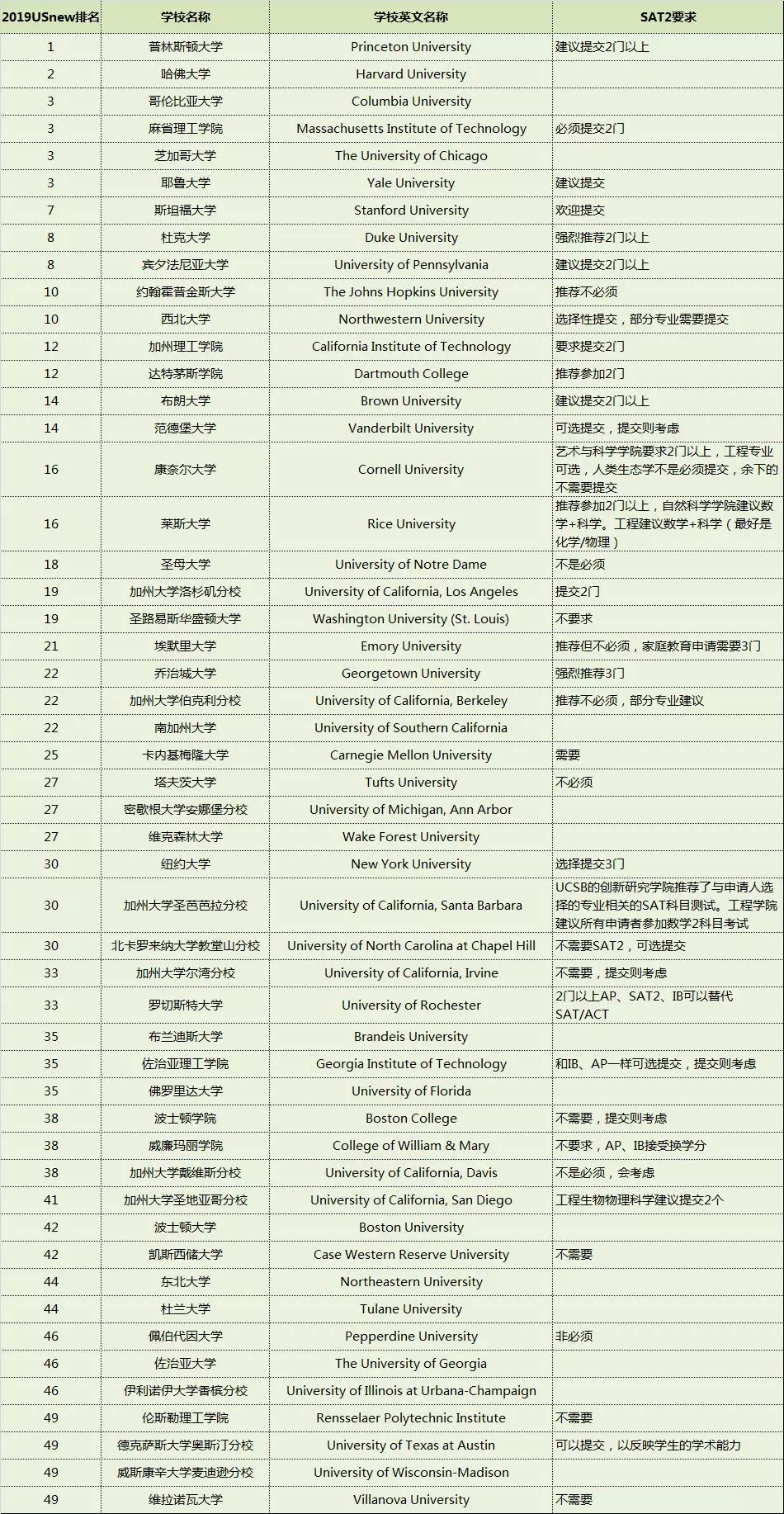 那么,哪些大学要求申请者必须提交SAT 2 成绩?哪些大学没有这个硬性要求?我们列出不同SAT 2 要求的学校名单: