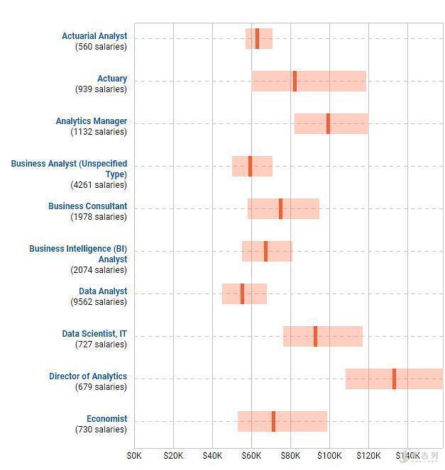 根据网站统计数据可以看到,数据分析师这个岗位年薪中位数也能达到54000美元,其他岗位年薪中位数都高于54000美元,分析总监年薪中位数高达13万美元,可以算得上一份高薪职业了。