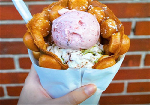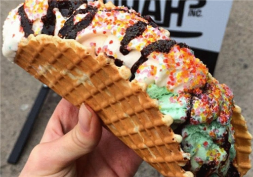 这家店最大的特点就是把冰淇淋装在华夫饼上,连早饭都不用吃,很有饱腹感。华夫饼被做成了Taco的样子,放上一个个冰淇淋球,再在冰淇淋上点缀着你爱吃的各种巧克力啊,糖啊,奶油啊等等。