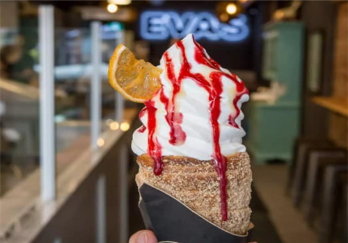 这家的特色是“烟囱”卷冰淇淋,一种用螺旋状中间空心的面包做蛋筒的冰淇淋。