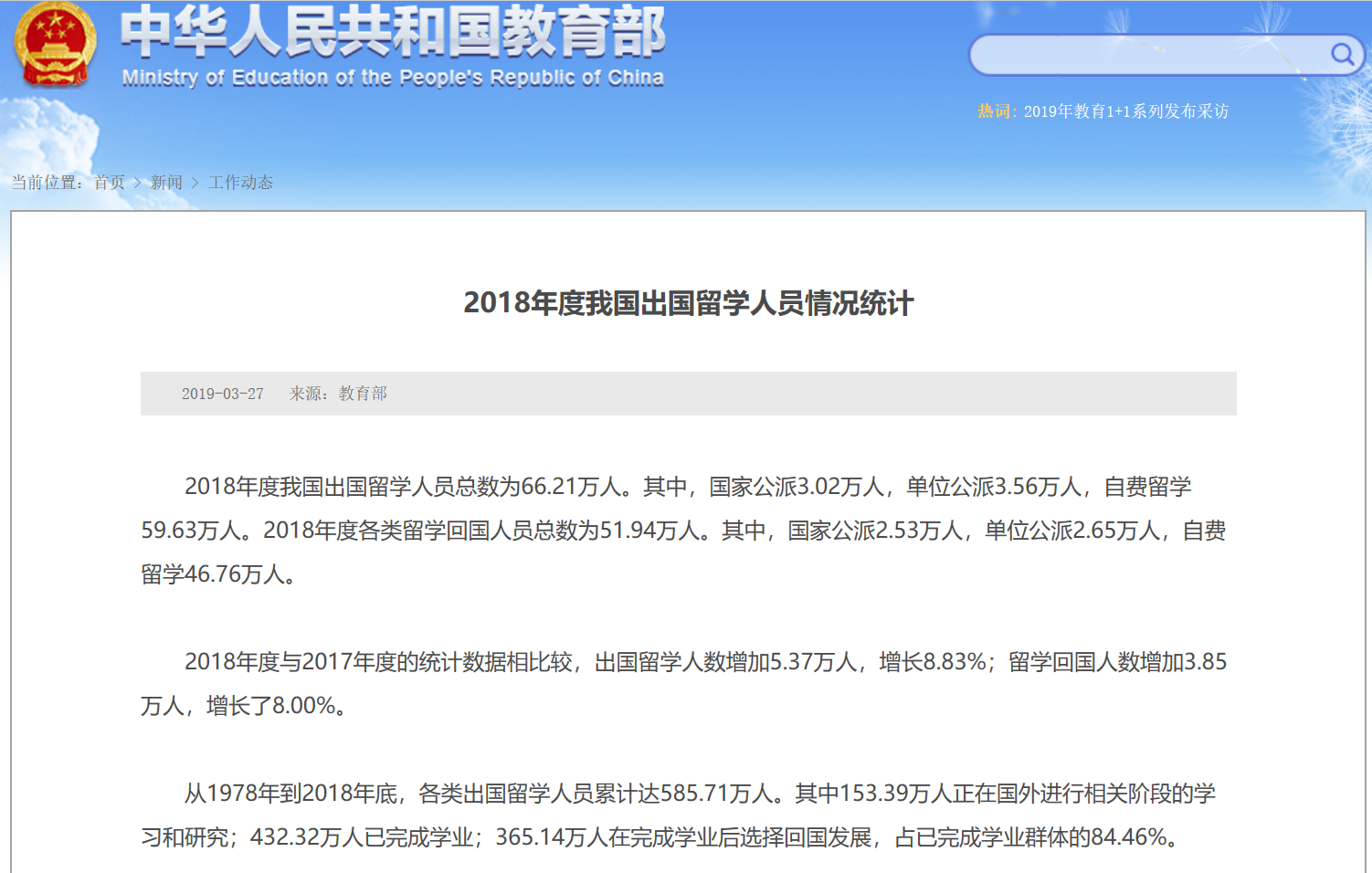 从1978年到2018年底,各类出国留学人员累计达585.71万人。其中153.39万人正在国外进行相关阶段的学习和研究;432.32万人已完成学业;365.14万人在完成学业后选择回国发展,占已完成学业群体的84.46%。