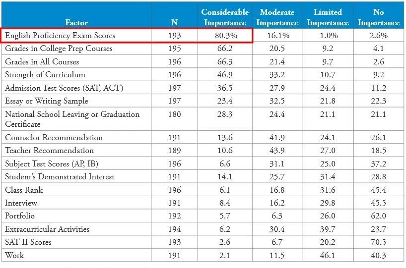 - 英语水平考试成绩(托福、雅思): 递交反馈的193所美国大学有80.3%认为,对国际生来说,最重要的申请因素是托福/雅思分数。