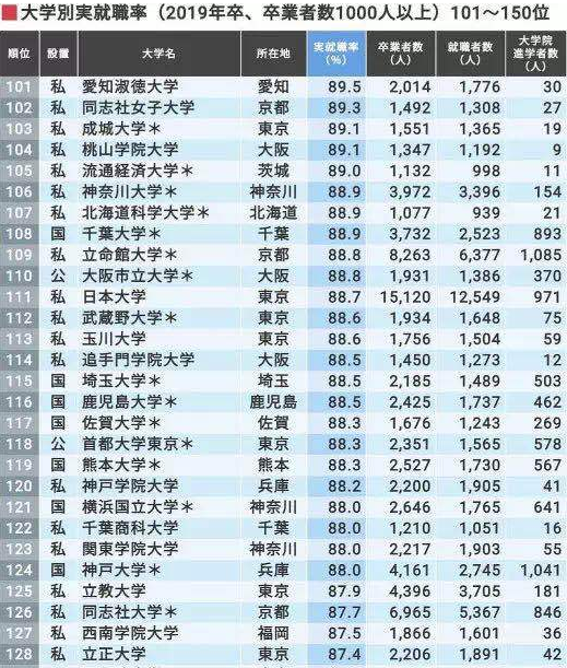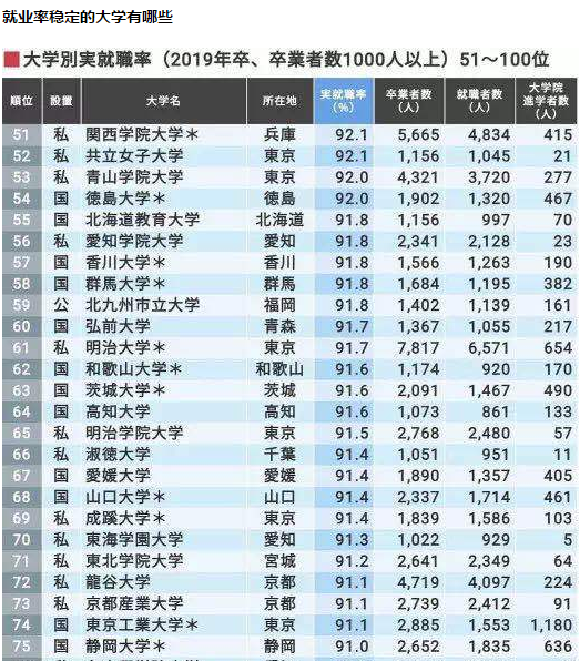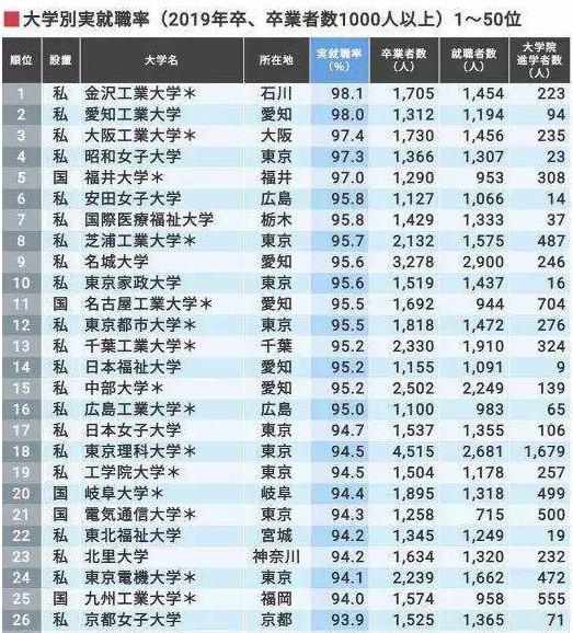 据统计,日本全部大学的实际就业率逐年上升,2019年比上一年增长0.7个百分点,达到89.1%。 在持续良好的就业环境中,实际就业率高的大学都是哪些? 以下为毕业生1000人以上的大学实际就业率排行榜,我们可以做一比较。