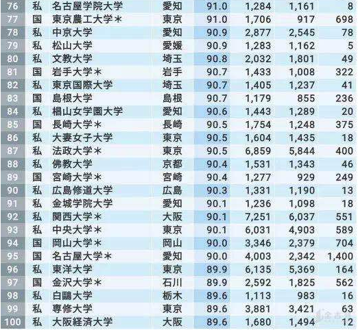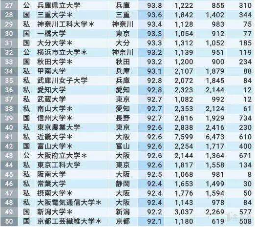 从高往低的顺序来看,去年排名第53位的近畿大学,今年排名第41位,实际就业率上升了0.9个百分点。 第72名龙谷大学上升了1.0个百分点,去年排名第86位。 第73位的京都产业大学也比去年上升了一个位次。 *从整个榜单来看,日本大学的实际就业率更能反映各个大学毕业生的就业情况。
