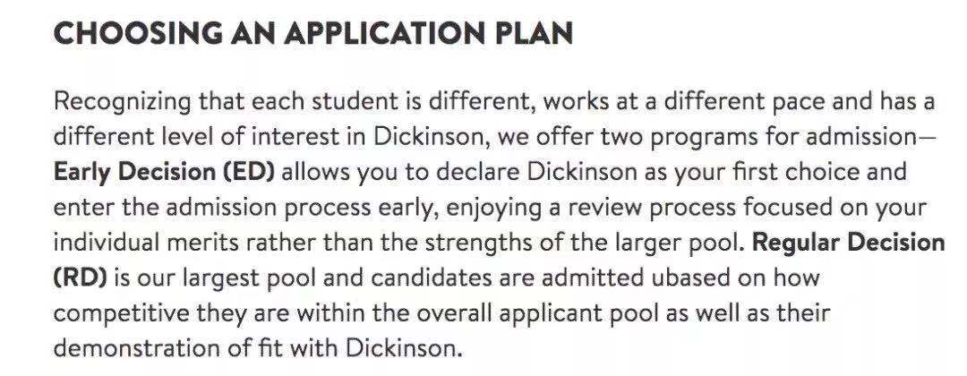 3.狄金森学院取消了 EA 政策,ED I 在 11月15日截止,ED II 和 RD 都是 1月15日截止申请,递交早申请后两周左右就能收到结果。