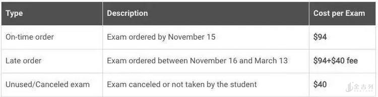 11月16日-3月13日,国际考生每一个科目多40美金;3月13日之前,如果取消考试,可退还部分报名费,官方收取40美元。