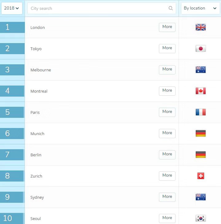 英国伦敦,日本东京,澳大利亚墨尔本分别占据前三。加拿大城市蒙特利尔排名第四!