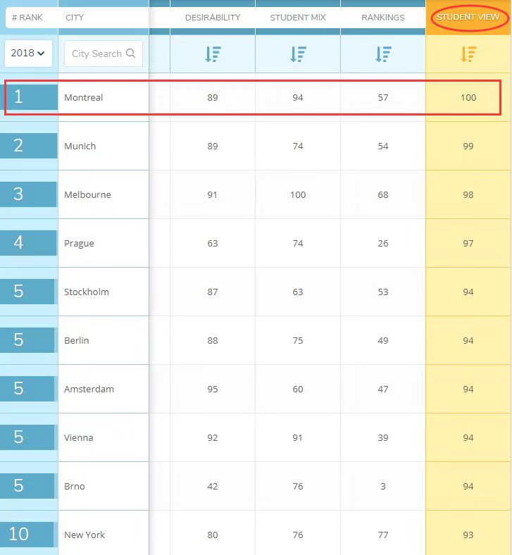 在Stuent View这一项里,加拿大的蒙特利尔排名世界第一!分数为100分。这也就说明,在蒙特利尔留学的学生对于这座城市的满意度是很高的。
