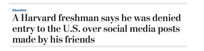 无独有偶, 综合外媒8月27日报道,如今正值开学季,多所高校迎来新学期。近日,一名哈佛大学的新生在入境美国时被拒,原因是海关官员查出其社交媒体上关注的人中,有人曾发表过“反对美国”的言论。 报 道称,这名学生名叫伊斯梅尔·阿扎维(Ismail Ajjawi),是来自黎巴嫩的巴勒斯坦居民,今年17岁。 上周五(23日),伊斯梅尔抵达美国波斯顿洛根国际机场,约8小时之后被驱逐出境。