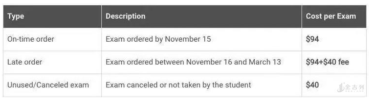 11月16日-3月13日,国际考生每一个科目多40美金;3月13日之前,如果取消考试,可退还部分报名费,官方收取40美元。