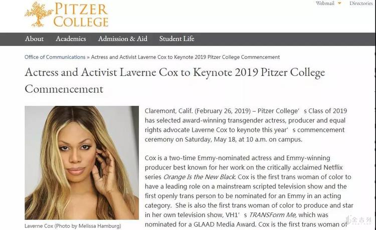 匹泽学院邀请了Laverne Cox担任2019年毕业典礼演讲嘉宾,拉弗恩·考克斯因出演《女子监狱》中的Sophia Burset出名,也因此于2014年成为史上第一个以公开变性人的身份获得艾美奖提名的演员。2014年4月,她因在争取变性人权益方面的贡献而被GLAAD授予Stephen F. Kolzak奖 。2014年6月9日,她成为首位登上《时代》杂志的公开变性人 。