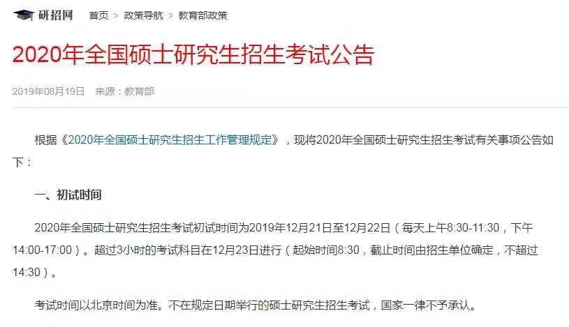 根据安排, 2020 年全国研究生入学考试的初始考试时间为 2019 年 12 月 21 日至 12 月 22 日(上午 8:30 至 11:30 ,下午 14:00 至 17:00 ),超过 3 小时的考试科目在 12 月 23 日进行。