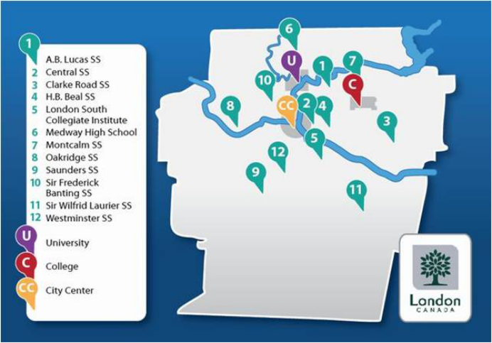 加拿大安大略省伦敦市,距离多伦多约2小时车程。伦敦市是加拿大著名城市之一,环境安全整洁,人民热情友好,交通完善便利。伦敦市四季分明,可以常年参加各种户外活动。伦敦市人口约36.8万,靠近美国边界及五大湖中的三个大湖,得天独厚的地理位置使得一切极为便利。伦敦市拥有出色的公共教育和世界级的高等院校及研究所,其中包括:韦士敦大学,韦士敦大学毅伟商学院,范莎学院。泰晤士河谷教育局是安大略省最大的公立教育局之一, 拥有132所小学+27所中学。入读该教育局的学生享有西安大略大学直通车 - 凡在该教育局顺利毕业的国际学生,均可免考雅思进入西安大略大学国王学院或布蕾舍尔学院(英语课程达到70%或大学开学前加读10周语言课程)。